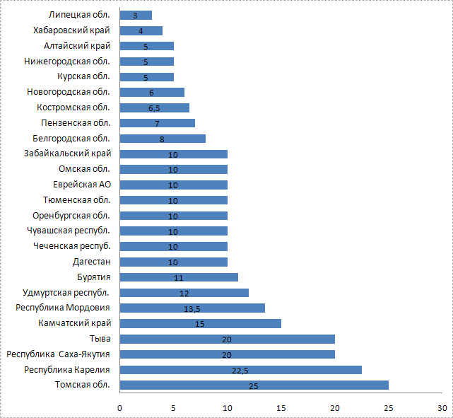 Рис.3. Максимальный срок инвестиционных проектов в регионах России. Разумеется, иностранный бизнес принимает заметное участие и в других отраслях экономики регионов. Многие территории опираются на помощь иностранных инвесторов и при строительстве логистических центров, и при строительстве жилья и гостиниц, и при развитии химического производства по производству пластиковых изделий, и при возведении систем водоочистки. Однако в целом пока можно констатировать отсутствие какой-либо системы в привлечении иностранного капитала в те или иные отрасли. По всей видимости, несмотря на длительную историю сотрудничества с иностранными инвесторами, российские регионы находятся в ее начальной фазе и просто вынуждены «латать дыры» в своей экономике. Многие регионы стоят накануне широкомасштабного освоения иностранных инвестиций, в связи с чем роль продуманной политики по их привлечению возрастает как никогда. Особый интерес представляет вопрос о том, насколько эффективно идет продвижение государственных планов по построению в стране инновационной экономики. Полученные от регионов ответы позволяют сделать следующие выводы. Во-первых, до сих пор большая часть российских регионов не имеет вообще никакой инновационной инфраструктуры. По нашим оценкам, в 27,7% регионов нет никаких объединений инноваторов, и никакой деятельности в данном направлении не наблюдается. Во-вторых, во многих территориях поддержка инноваций носит откровенно показной характер, не подкрепляясь конкретными достижениями. По приблизительным расчетам примерно в 20% регионов работа в этом направлении организована чисто формально. Например, в Новгородской области государством создан «Новгородский научно-координационный центр», который себя пока никак не проявил. В Камчатском крае только в 2009 г. был создан Совет по науке и инновациями при губернаторе края. Такие акции идут, скорее, под давлением центра и тотальной агитации, нежели по инициативе местных инноваторов. Есть и откровенно конъюнктурные акции. Так, в Удмуртии вся инновационная деятельность свелась к созданию «Регионального центра наноиндустрии Удмуртской Республики», которая отражает веяния современной инновационной «моды». В-третьих, между регионами наблюдаются очень серьезные различия в инновационной активности. На фоне примитивных формальных «отмазок» можно наблюдать и довольно зрелые инновационные системы. Например, в Тульской области уже в 1999 г. было создано некоммерческое партнерство «Тульская региональная лига научно-технического и инновационного предпринимательства» (Лига «Тула-Интех). Таким образом, в данном регионе история инновационного движения начитывает, по крайней мере, 11 лет, в течение которых Лигой было разработано 80 видов высокотехнологичных изделий в разных областях промышленности, нашедших применение как в России, так и за рубежом. Сейчас в составе Лиги состоит 24 предприятия численностью более 1,5 тыс. человек и годовым объемом производства примерно в 1 млрд. руб. Лига взаимодействует с органами исполнительной власти и органами местного самоуправления, участвует в разработке и реализации областных целевых программ. По данному пути идет и Хабаровский край, где создана автономная некоммерческая организация «Дальневосточное агентство по содействию инновациям». В ц