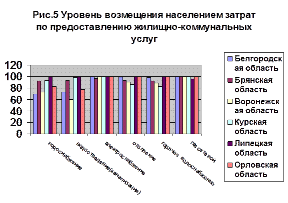 Из диаграммы рис.6 самый высокий уровень возмещения населением затрат по предоставлению жилищных услуг составляет Липецкая область (100 %), самый низкий уровень Брянская область (89%). Самый высокий уровень возмещения населением затрат по предоставлению коммунальных услуг составляет тоже Липецкая область (99%), а самый низкий Воронежская область (91%). Таблица 5