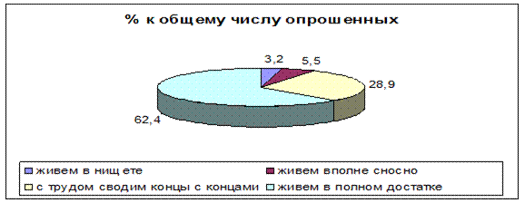 Преодоление бедности сельского населения - важнейшая задача России на современном этапе Центральной России до 12% всех доходов приходилось на личное подсобное хозяйство, сбор дикорастущих растений, грибов и т.д. Переходный период сопровождался увеличением неравенства в обладании имуществом, экономической отдачи от образования, доступности государственного образования и здравоохранения. Смертность сельского населения за годы реформ увеличилась на 17% и на 21% превышает соответствующий показатель в городе. Наряду с этими негативными моментами наблюдалось снижение рождаемости. Причем социологи отмечали прямую зависимость этого явления от ухудшения условий жизни. Специалисты Центра всероссийского мониторинга социально-трудовой сферы села провели в 1999 г. исследования, по результатам которых более 40% опрошенных сельчан не хотели иметь детей, а те, кто хотел, предпочитают отложить это событие на потом. И в качестве основных причин в этом случае назывались неуверенность в завтрашнем дне, тяжелое материальное положение семьи, плохие жилищные условия и состояние здоровья. А ведь дети в крестьянских семьях всегда рассматривались как потенциальные работники, помощники в нелегком крестьянском труде. Сравнение доходов домохозяйств с их порогом бедности позволило получить такие данные, как удельный вес населения с доходами ниже порога бедности, определить дефицит доходов, индекс глубины бедности. Проведенный в 2005 году анализ демографического состава бедных домохозяйств в Самарской области выявил следующее: 74,1 % бедных из полных семей и 62,1 % из неполных находятся в трудоспособном возрасте, 21,6 % - дети в возрасте до 16 лет. 55,5 % членов полных семей и 54,8 % членов неполных семей заняты в различных сферах экономики (работают не в сельском хозяйстве). Безработные составляют 4,8%) в полных семьях и 3,7 % в неполных. Пенсионеры, студенты и школьники - 38,8 % всех членов полных семей и 31,5 % неполных. Анализ уровня образования показал: 49,6 % бедных из полных семей и 34,5 % из неполных семей имеют среднее профессиональное, высшее и неполное высшее образование. По результатам опроса выявлено, что большая часть обследованных семей проживает в отдельных домах (56,3 %) и квартирах (23,1 %). Только 1,6 % семей проживают в части дома и 1,3 % - в общежитии. 256 домохозяйств (82,4 %) имеют собственное жилье, 48 (15,4 %) - жилье, находящееся в собственности предприятия (организации). Органам местной власти принадлежит 1,6 % жилья. В Самарской области 35,4% обследованных сельских домохозяйств имеют земельные доли, средний размер которых составляет 15,8 га. Почти все их владельцы (за исключением 2 домохозяйств) пытаются извлечь из своей земельной доли какой-либо доход, в основном передав ее в уставный капитал сельскохозяйственных организаций (61,8%) либо сдавая ее в аренду юридическим и физическим лицам (35,5%). Только 1 домохозяйство выделило земельную долю в натуре и обрабатывает ее самостоятельно, т.к. выделение земельной доли, связано для селян со значительными затратами на ее оформление. На рис. 1 представлена диаграмма распределения ответов респондентов на вопрос: "К какой из следующих групп населения Вы могли бы отнести свою семью?"[3] По самооценке, к пласту бедных относят себя около трети респондентов (28,9 %), которые ответили, что с трудом сводят концы с концами. Тех, кто отнес себя к категории нищ