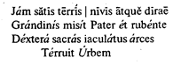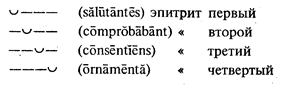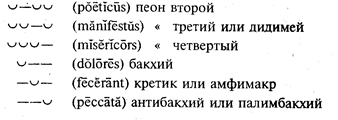 Так как античные стопы не могли содержать менее двух или более четырех слогов, то этими 28-ю стопами исчерпываются все возможные комбинации из долгих и кратких слогов, образующие стопы. В стихах границы стопы и границы слов (словоразделы) могли и не совпадать. Но конец стиха, после которого должна была быть пауза, обязательно совпадал с концом слова. Последняя стопа могла быть не равна метрически с остальными стопами стиха. Если она была короче остальных, стих именовался каталектическим, если она равнялась остальным, – акаталектическим, и если она была длиннее остальных, – гиперкаталектическим. На каждую стопу падало ритмическое ударение, называемое иктом. Слог, на который падал икт, назывался арсисом в отличие от неударной части стопы (тезис). Обычно икт падал на первый долгий слог стопы. Замечу, что и в современной музыке ударение падает преимущественно (хотя и не обязательно) на долгие ноты. См. в приведенном примере стопы (вста)вай про(клятьем), (весь) мир го(лодных), ( ки)пит наш, бой ве-сти го (тов). Таким образом главными характеристиками стопы были два признака: длина стопы в морах и положение икта. Стих определялся числом и характером стоп. Наиболее распространенным стихом был гекзаметр, состоявший из шести четырехмерных стоп с иктом на первом слоге. Из всех четырехмерных стоп начинаются на долгий слог (который может принять на себя ритмическое ударение) две: спондей и дактиль. Гекзаметр и состоял из спондеев и дактилей, причем обычно пятая стопа была дактилем, что же касается шестой, то она обязательно была двусложна и могла быть равна остальным (спондей) или короче их (хорей). Вот пример латинского гекзаметра (размечаю в первой строке долгие и краткие, в остальных только икты).