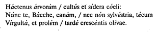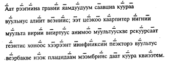 Для правильности чтения удобно сопровождать чтение отбиванием в такт рукою мор, ударяя особенно сильно 1-ю, 5-ю, 9-ю и т.д. через четыре моры каждого стиха. Весь стих состоит из 36 мор. «Сольфеджируя», т.е. произнося на слог «та» схему гекзаметра, получим: