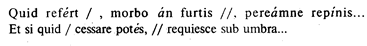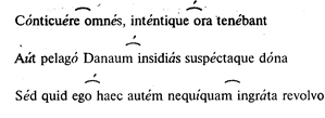 В гекзаметре обычно было деление стиха на два периода. Это деление соответствовало как бы перехвату ритмико-мелодической линии (гекзаметр по своей длине – от 13 до 17 слогов – представлял обычно два, а иногда и три речевых колона). Это деление называлось цезурой. Цезура совпадала со словоразделом. Могла она приходиться в разных местах. Преимущественно она попадала после арсиса третьей стопы: