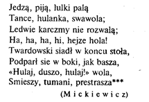 ** Дифтонги образуются только при соединении «i» со следующим гласным. Так, слово «nie» – односложно. *** Пьют, курят, едят, веселятся: Не пир – разливанное море! Чуть стены корчмы не валятся... «Ай жги да гуляй, мое горе!» Пашой подбоченясь, Твардовский В корчме за столом заседает, Гарцует и чарой бесовской Туману в глаза напускает. (Перев. М е я.) Так как польские слова имеют ударение на предпоследнем слоге, то польские стихи имеют преимущественно женские окончания. Для образования мужской рифмы необходимо поставить в конце стиха односложное слово, например: