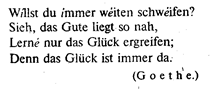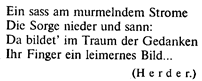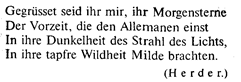 Стих этот употреблялся в трагедии (Шекспир, в Германии Шиллер и др.). Александрийский стих, проникший (в форме шестистопного ямба с цезурой после 6-го слога) в германские литературы под французским влиянием, не привился и встречается как у немцев, так и у англичан очень редко. Его место заступил главным образом пятистопный бесцезурный ямб, который разновременно испытывал влияние французского десятисложника и итальянского эпического стиха (примеры см. выше). Именно из германских литератур этот размер проник в Россию, где также вытеснил в драматической литературе шестистопный ямб – александрийский стих, заимствованный у французов. Двусложные размеры являются господствующими в немецкой литературе. Трехсложные размеры встречаются гораздо реже. Эти размеры характеризуются тем, что ударение падает не на каждый второй, а на каждый третий слог, через два. Таким образом, скандуемая группа (стопа) – трехсложна. Если первое ударение падает на первый слог стиха (и далее на 4-й, 7-й и т.д.), мы имеем дактилический стих, если на второй (5-й, 8-й и т.д.) – амфибрахический, если на третий (6-й, 9-й и т.д.) – анапестический. Не умножая примеров, приведу лишь образец амфибрахического немецкого стиха: