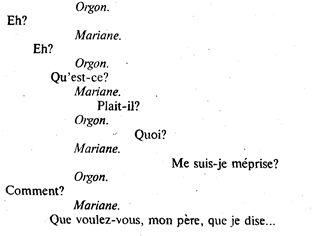 Г-жа Пернель, мать Оргона – Флипота, служанка г-жи Пернель. Оргон – Эльмира, жена его – Клеант, брат Эльмиры. Дамис, сын Оргона, Марианна, дочь Оргона. Валер, возлюбленный Марианны, Дорина, Горничная Марианны. Тартюф Эпизодические лица: г-н Лойяль, офицер. Действие в доме Оргона в Париже. Акт I. Явление I. Мать Оргона г-жа Пернель раздражительно читает нотацию всем членам семьи Оргона (кроме самого отсутствующего Оргона). Из перекрестных реплик мы узнаем, что на фоне ее недовольства всеми она испытывает чувство особого уважения к какому-то Тартюфу, ненавидимому всеми остальными. Обнаруживается существование в семье Оргона двух лагерей – Тартюф, Оргон и его мать – с одной стороны, остальные – с другой. Явление II. Все уходят провожать г-жу Пернель, кроме Дорины и Клеанта. В речи Дорины дается характеристика Тартюфа, притворного ханжи, втершегося в доверие Оргона и поселившегося в доме Оргона, где он всем управляет. Явления III и IV. Из коротких реплик мы узнаем о любви Марианны и Валера (а также о любви Дамиса и сестры Валера – традиционная параллель французских комедий), препятствием которой является Тартюф. Явления V и VI. Из разговора пришедшего Оргона с Дориной и Клеантом выясняется, в форме комических реплик, ослепление Оргона насчет Тартюфа и нежелание его слушать здравые советы Клеанта. На вопрос Клеанта о судьбе Марианны, на брак которой с Валером Оргон прежде соглашался, Оргон отвечает уклончиво. Акт II. Явления I и II. Оргон объявляет Марианне о своем решении выдать ее замуж за Тартюфа. Дорина (тип комедийной служанки, двигающей диалог и основные «пружины» интриги) вступает в комический спор с Оргоном, сопровождаемый игрой (преследование Дорины Оргоном). Явления III и IV развивают любовную интригу Марианны и Валера с характерными ссорами, примирением (при содействии направляющей действия Дорины), излияниями, объяснениями и т.п. Акт III. Явление I. Дамис выражает Дорине свою ненависть по отношению к Тартюфу. Явление II. Появление Тартюфа. (Комедия «Тартюф» представляет собой исключительное явление позднего появления героя. На протяжении двух актов о Тартюфе только говорилось, и сам он не появлялся). Диалог Тартюфа и Дорины характеризует непомерную деланную стыдливость Тартюфа. Явления III и IV. Тартюф и Эльмира (подготовка развязки). Неожиданно обнаруживается тайная страсть, которую Тартюф испытывает к Эльмире. Он объясняется ей в любви (Дамис подслушивает из соседней комнаты). Дамис врывается с намерением разоблачить Тартюфа. Явления V и VI. Явившийся Оргон во всем верит Тартюфу, слова сына принимает за клевету, проклинает его, прогоняет и здесь же передает свое имущество в дар Тартюфу. Акт IV. Явление I. Клеант хочет добиться у Тартюфа заступничества перед Оргоном за Дамиса, но встречает отказ. Тартюф уходит. Явления II-IV. Оргон объявляет семье свою волю выдать Марианну замуж за Тартюфа, но Эльмира предлагает ему убедиться лично в лицемерии Тартюфа. Оргон прячется под стол, Эльмира остается одна и зовет Тартюфа. Явления V–VII. Оргон подслушивает разговор Тартюфа и Эльмиры, убеждается в его притворстве и прогоняет его. Тартюф уходит с угрозами. Явление VIII. Оргон признается жене в передаче имущества Тартюфу и выражает беспокойство по поводу какого-то ящика. Акт V. Явления I и II. Оргон выясняет историю ящика, в котором он хранил порученные ему другом – 