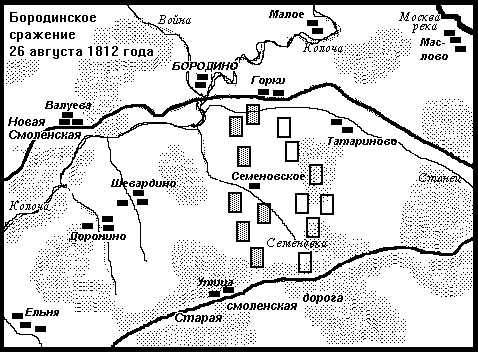 Обдумывая предстоящую битву, Наполеон колебался между двумя вариантами ведения боевых действий. Маршал Даву советовал ему обойти главные силы русской армии по слабо защищенной Старой Смоленской дороге, быстро достичь города Можайска, где сходятся дороги на Москву, и отрезать русским путь к столице. В конце концов, Наполеон, опасаясь, что Кутузов опять умело сманеврирует и уклоняется от сражения, предпочел другой вариант. Он решил атаковать главными силами левый фланг русской позиции - Семеновские флеши, прорвать там оборону русских войск, оттеснить их к реке Калоче и уничтожить. При этом главный удар французской армии должен был сопровождаться вспомогательными атаками в центр русской позиции, на Курганную высоту, а также наступлением французского корпуса генерала Понятовского по Старой Смоленской дороге на Утицкую высоту. Кутузов учел обе эти возможности. На правом фланге и в центре он разместил войска 1-й армии под командованием Барклая. Господствующую над полем высоту занял пехотный корпус генерала Раевского. Левый фланг с Семеновскими флешами должна была оборонять 2-я армия Багратиона (поэтому Семеновские флеши называют "Багратионовы"). Наконец, на самом левом краю поля, близ Утицкого кургана, Кутузов поставил корпус генерала Николая Тучкова, который должен был прикрывать Старую Смоленскую дорогу. Но главное - в распоряжении Кутузова имелся большой резерв, который он мог использовать, когда замысел Наполеона станет более ясным.