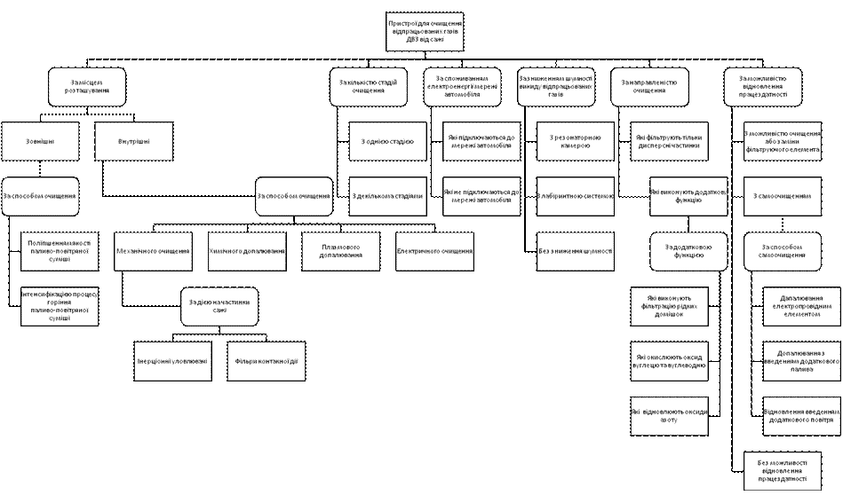 Незважаючи на численні позитивні показники даного пристрою, він все-таки не є ідеальним. Адже показники питомих викидів дисперсних часток (сажі), ресурс роботи й інші покращення й оптимізація пристрою все ще можливі. У даному напрямку на кафедрі Автомобілів і механіки технічних систем Житомирського державного університету ведуться розробки, які вже принесли конкретні успіхи. Через великий потенціал даного пристрою й гарні показники його роботи даний фільтр був взятий за прототип для досліджень. Розроблено спосіб і конструкція, що дозволяють поліпшити процес фільтрування часток сажі. В основі даної оптимізації лежить виведена на кафедрі формула оптимальної температури частинки сажі для найкращого її осадження на фільтруючому матеріалі. Це дозволить не тільки поліпшити показники фільтрування відпрацьованих газів ДВЗ від частинок сажі, але й збільшити ресурс і показники окисно-відновлювальних каталізаторів, оскільки вони будуть менш забруднені даними частинками під час роботи. Варто відзначити, що дана розробка кафедри може використовуватися й на інших пристроях очищення відпрацьованих газів ДВЗ від частинок сажі з механічним способом очищення. 3. Класифікація пристроїв для очищення відпрацьованих газів ДВЗ від частинок сажі На основі аналізу пристроїв для очищення відпрацьованих газів ДВЗ від частинок сажі була виведена їхня класифікація з відображенням позитивних та негативних властивостей. Дана класифікація для наочного ознайомлення представлена на рисунку 7, а її повна версія виглядає наступним чином: 1. За місцем розташування: а) внутрішні: · за способом очищення (дані методи орієнтовані на оптимізацію показників роботи самого двигуна, що в свою чергу приводить до поліпшення показників викидів токсичних газів ): - оптимізація форми впускних та випускних каналів, які створюють направлений рух повітря в камері згоряння; - підвищення тиску впорскування, наприклад за допомогою насос-форсунок; - оптимізація камери згоряння, наприклад, за рахунок зменшення «шкідливих» об’ємів та форми виїмки у поршні. б) зовнішні: · за способом очищення: - механічного очищення, які за дією на частинки сажі поділяються на: - інерціонні уловлювачі (+ гарні показники вловлювання сажі, можливість вловлювання рідких домішок відпрацьованих газів; - складність конструкції, велика металоємність, великі енерговитрати, складність відновлення працездатності ); - фільтри контактної дії (+ гарні показники вловлювання сажі, вловлювання часток сажі малого розміру; - мала продуктивність, малий термін служби фільтруючого елемента, зміна в часі продуктивності, гідравлічного опору й ефективності ); - хімічного допалювання (+ малі енерговитрати; - дорожнеча матеріалів, малий термін служби, можливість роботи у вузькому спектрі умов ); - плазмового допалювання (+ гарні показники очищення й нейтралізації відпрацьованих газів; - великі енерговитрати, використання додаткового палива, несприятливі теплові режими у вихлопній системі, зростання обсягу відпрацьованих газів, складність конструкції ); - електричного очищення (+ гарні показники уловлювання сажі, малий гідравлічний опір, можливість керування інтенсивністю та шпаруватістю очищення; - потреба в попередній підготовці відпрацьованих газів перед очищенням, великі енерговитрати, складність конс