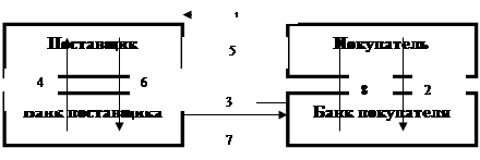 Рис.1 Аккредитивная форма расчётов с предварительным депонированием средств. 1 – заключение договора о расчётах с использованием аккредитивной формы расчётов с предварительным депонированием средств на отдельном счёте в банке; 2 – передача в банк заявления на открытие аккредитива, платежного поручения о депонировании средств, а затем списание средств со счёта покупателя; 3 – перевод средств в банк поставщика и зачисление средств на счёт «Аккредитивы»; 4 – сообщение поставщику об открытии аккредитива; 5 – поставка товара (оказание услуг); 6 – расчётные документы, подтверждающие отгрузку товара (оказание услуг), в соответствии с условиями договора направляются в банк поставщика, и осуществляется списание средств со счёта «Аккредитивы» и зачисление средств на счёт поставщика; 7 – сообщение об использовании аккредитива направляется в банк покупателя; 8 – сообщение покупателю об использовании аккредитива. При установлении между банками корреспондентских отношений непокрытый (гарантированный) аккредитив может открываться в исполняющем банке путем предоставления ему права списывать всю сумму аккредитива с ведущегося у него счёта банка-эмитента (рис.2).