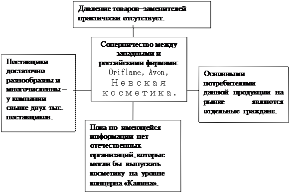 Рисунок 2‑2 критерии конкурентных преимуществ на рынке (по информации КМ-Групп) Таким образом, на первое место выходит реклама бренда и ценовая политика. Чтобы привлечь внимание потребителя и повысить узнаваемость товара на полке среди конкурентов, компании нередко прибегают к нестандартным решениям. Преимущества, которые позволят в перспективе занять лидерство на рынке: - внедрение инновационных рецептур, обеспечивающих уход и сохранение молодости; - соответствие ожиданиям потребителей; - ценовые преимущества по сравнению с конкурентами при аналогичном качестве косметики; - содержание на складе актуального ассортимента для потребителя. Представим более подробно список факторов конкурентоспособности по степени их важности: · лидерство в ключевых сегментах российского рынка косметика и парфюмерия на основе высоких показателей узнаваемости брендов и лояльности со стороны потребителей; · широта и создание эффективной дистрибьюторской сети в России; · гибкая ценовая политика, позволяющая устанавливать невысокие по сравнению с иностранными компаниями цены на продукцию, которая соответствует по качеству зарубежным брендам; · необходим эффективный процесс создания новых продуктов на основе глубокого изучения предпочтений потребителей и использования инновационных идей. Важно использовать современные технологии и постоянно обновлять производственный комплекс, позволяющего выпускать косметику качества, соответствующего международным стандартам. [6] Определение форм и интенсивности конкуренции: На парфюмерно-косметическом рынке наблюдается монополистическая конкуренция: большое количество фирм производит в принципе схожую продукцию, которая может отличаться по некоторым показателям, таким, как цена, состав косметического средства, внешнее исполнение, которые и оказывают влияние на выбор потребителя. В рамках модели 5 сил конкуренции Майкла Портера, наиболее существенным фактором является соперничество между уже утвердившимися на рынке конкурирующими продавцами. На рынке функционируют, как российские (очень мало компаний), так и иностранные производители (в основном). Соперничество между западными и российскими фирмами: Oriflame, Avon, Невская косметика, Lumene, Maybelline, Loreal. В каждом отдельном сегменте рынка парфюмерии и косметики конкурируют не одни и те же компании, количество основных конкурентов в каждом отдельном сегменте порядка 5-6. Определение силы конкуренции (по М. Портеру) в отрасли: