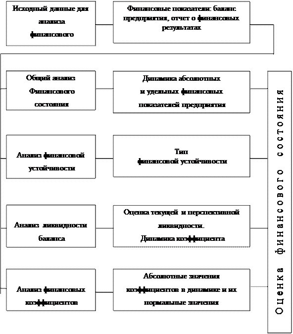 Несмотря на относительную простоту использования этой модели для оценки угрозы банкротства, хотелось бы обратить внимание на то, что применение модели Альтмана в изложенном виде не позволяет получить объективный результат в наших условиях. Прежде всего, при расчетах показателей уровня рентабельности, доходности и оборачиваемости активов (соответственно К2 , К3 , К5 ) в условиях инфляции нельзя использовать балансовую стоимость этих активов, т.к. в этом случае все рассматриваемые показатели будут искусственно завышены. Поэтому при расчетах должна быть использована восстановительная (рыночная) стоимость этих активов. При расчете коэффициента соотношения используемого капитала (К4 ) собственный капитал должен быть также оценен по восстановительной (рыночной) стоимости с учетом его авансирования в различные активы (основные фонды, нематериальные активы, запасы товароматериальных ценностей и т.п.). При расчете отношения чистого рабочего капитала к активам (К1 ) коррективы должны быть внесены в оба показателя. Сумма чистого рабочего капитала должна быть уменьшена на сумму внутренней кредиторской задолженности, которая носит стабильный характер и не может служить угрозой банкротства. Сумма активов должна быть скорректирована с учетом вышеизложенных требований. Наконец, сама система коэффициентов значимости отдельных факторов в условиях нашей экономики должна быть пересмотрена. Так, вряд ли можно согласиться с тем, что уровень доходности активов в наших условиях (особенно в условиях высокого уровня монополизации отдельных рынков) более чем в пять раз превосходит по значимости коэффициент соотношения различных видов используемого капитала, определяющий финансовую устойчивость предприятия. Кроме того, значения каждого из этих коэффициентов должны быть в наших условиях дифференцированы с учетом отраслевых особенностей деятельности предприятий (в зарубежной практике в такой дифференциации нет столь высокой необходимости в связи со свободным межотраслевым переливом капитала в целях выравнивания нормы прибыли). Корректировка коэффициентов значимости отдельных факторов является наиболее настоятельным требованием при использовании модели Альтмана в наших условиях для объективной оценки угрозы банкротства предприятия. Глава 2. АНАЛИЗ ФИНАНСОВОГО СОСТОЯНИЯ ООО «ОПТИМА» В целях определения достаточности принадлежащего должнику имущества для покрытия судебных расходов, расходов на выплату вознаграждения арбитражным управляющим, а также возможности (или невозможности) восстановления платежеспособности должника проводится финансовый анализ. Основная цель финансового анализа – оценка финансового состояния и выявление возможностей повышения эффективности функционирования предприятия. Основная цель – эффективное управление финансовыми ресурсами предприятия. Информационная база анализа - бухгалтерская отчетность предприятия, как правило годовая: баланс предприятия – форма № 1, отчет о финансовых результатах – форма № 2. Составляющие финансового анализа предприятия: общий анализ финансового состояния, анализ финансовой устойчивости, анализ ликвидности баланса, анализ финансовых коэффициентов, анализ рентабельности и деловой активности. Схема анализа финансового состояния предприятия приведена на 