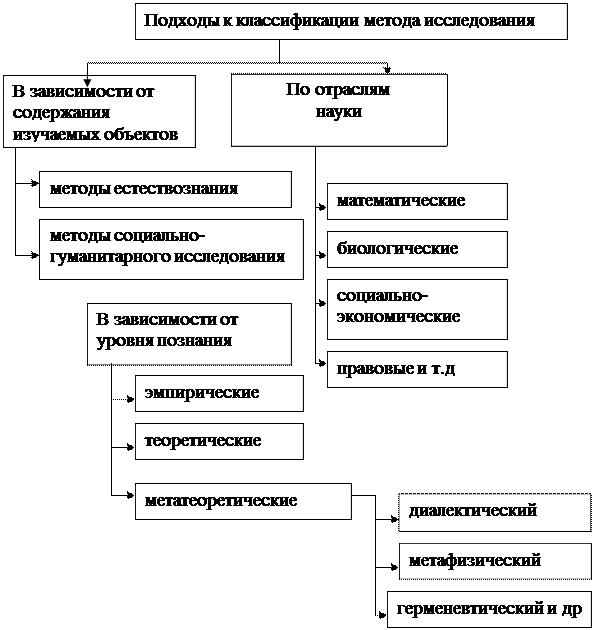 Рис.1 - Подходы к классификации метода исследования К методам эмпирического уровня относят наблюдение, описание, сравнение, счет, измерение, анкетный опрос, собеседование, тестирование, эксперимент, моделирование и т.д. К методам теоретического уровня причисляют аксиоматический, гипотетический, формализацию, абстрагирование, общелогические методы (анализ, синтез, индукцию, дедукцию, аналогию) и др. Методами метатеоретического уровня являются диалектический, метафизический, герменевтический и др. Некоторые ученые к этому уровню относят метод системного анализа а другие его включают в число общелогических методов. В зависимости от сферы применения и степени общности различают методы (рис.2.).