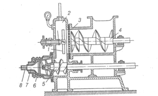 Рис. 1 Ленточный вакуум-пресс Рис. 2 Сушка кирпича сырца: 1- нож; 2- вакуум-камера; 3- решетка; 4- глиномялка; 5- шнековый вал пресса; а – без обработки; б – с обработкой наружных граней влагозадерживающими составами. 6- прессующая головка; 7- мундштук; 8- глиняный брус. Д – направления действия усадочных деформирующих сил. 1 – кирпич сырец; 2- ядро уплотнения со свилевыми трещинами; 3 – разрывные трещины; 4 – волосяные трещины; 5 – угловые трещины; 6 – обработанные грани.