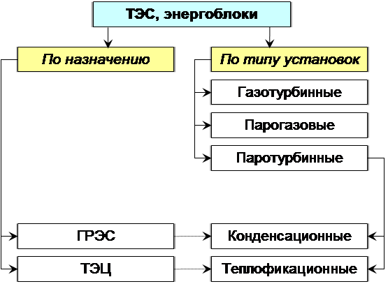Рис.1. Типы электростанций на органическом топливе. Среди ТЭС преобладают тепловые паротурбинные (ПТУ),на которых тепловая энергия используется в парогенераторе для получения водяного пара высокого давления, приводящего во вращения ротор паровой турбины, соединённый с ротором электрического генератора(обычно синхронного генератора).В качестве топлива на таких ТЭС используют уголь(преимущественно), мазут, природный газ. ПТУ, имеющие в качестве привода электрогенераторов конденсационные турбины и не использующие тепло отработавшего пара для снабжения тепловой энергией внешних потребителей, называются конденсационными электростанциями. ПТУ оснащённые теплофикационными турбинами и отдающие тепло отработавшего пара промышленным или коммунально-бытовым потребителям, называют теплоэлектроцентралями (ТЭЦ). ТЭС с приводом электрогенератора от газовой турбины называются газотурбинными электростанциями (ТЭС с ГТУ – газотурбинная установка).В камере сгорания ГТУ сжигают газ или жидкое топливо; продукты сгорания с температурой 750-900 ° С поступают в газовую турбину, вращающую электрогенератор. КПД таких ТЭС с ГТУ обычно составляет 30-33 %, мощность - до нескольких сотен МВт. ГТУ обычно применяются для покрытия пиков электрической нагрузки. ТЭС с парогазотурбинной установкой, состоящей из паротурбинного и газотурбинного агрегатов, называется парогазовой электростанцией (ТЭС с ПГУ, а часто - ПГУ ). КПД которой может достигать 56-58 %. ТЭС с ГТУ или ПГУ могут отпускать тепло внешним потребителям, то есть работать как ТЭЦ. [2] Немаловажную роль среди тепловых установок играют конденсационные электростанции (КЭС). Простейшая принципиальная схема КЭС, работающей на угле, представлена на рис.2. Топливо поступает в топку парогенератора (парового котла) 1, имеющего систему трубок, в которых циркулирует химически очищенная вода, называемая питательной. В котле вода нагревается, испаряется, а образовавшийся насыщенный пар доводится до температуры 400—650°С и под давлением 3—24 МПа поступает по паропроводу в паровую турбину 2. Параметры пара зависят от мощности агрегатов. Далее одна часть пара полностью используется в турбине для выработки электроэнергии в генераторе 3 и затем поступает в конденсатор 4, а другая отбирается от промежуточных ступеней турбины и используется для подогрева питательной воды в подогревателях 6 и 9. Конденсат насосом 5 через деаэратор 7 и далее питательным насосом 8 подается в парогенератор. Тепловые конденсационные электростанции имеют невысокий кпд (35— 40%), так как большая часть энергии теряется с отходящими топочными газами и охлаждающей водой конденсатора. [3]