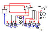 Рис.3 Принципиальная схема ТЭЦ 1 – паровой котел; 2 – РОУ; 3 – турбогенератор; 4 – тепловой потребитель;5 – насос; 6 – регенеративные подогреватели; 7 – питательный насос;8 – конденсатор; 9 – конденсатный насос; 10, 11 – пар из отборов. Топливо поступает в топку парогенератора (парового котла) 1, имеющего систему трубок, в которых циркулирует химически очищенная вода, называемая питательной. . В котле вода нагревается, испаряется, а образовавшийся насыщенный пар доводится до температуры 400—650°С и под давлением 3—24 МПа поступает по паропроводу . Одна часть пара полностью используется в турбине для выработки электроэнергии в генераторе 3 и затем поступает в конденсатор 8, а другая, имеющая большую температуру и давление, отбирается от промежуточной ступени турбины и используется для теплоснабжения 4. Количество отбираемого пара зависит от потребности предприятий в тепловой энергии. Выработка электроэнергии зависит от пропуска этого пара. Для теплофикационных турбин(такие турбины работают на ТЭЦ) выработка электроэнергии и отпуск тепла могут изменяться в широких пределах. Некоторые преимущества тепловых станций по сравнению с другими типами станций заключаются в следующем: 1. В относительно свободном территориальном размещении, связанном с широким распространением топливных ресурсов; 2.В способности (в отличие от ГЭС) вырабатывать энергию без сезонных колебаний мощности; 3.В том, что площади отчуждения и вывода из хозяйственного оборота земли под сооружение и эксплуатацию ТЭС, как правило, значительно меньше, чем это необходимо для АЭС ; 4.ТЭС, в связи с массовым освоением технологий их строительства, сооружаются гораздо быстрее, чем ГЭС или АЭС, а их стоимость на единицу установленной мощности значительно ниже по сравнению с АЭС и ГЭС. В то же время ТЭС обладают и крупными недостатками, в том числе некоторые из них: 1. для эксплуатации ТЭС обычно требуется гораздо больший персонал, чем для ГЭС сопоставимой мощности, связанной с обслуживанием очень масштабного по объему топливного цикла; 2. ТЭС постоянно зависят от поставок невозобновляемых (и нередко привозных) топливных ресурсов (уголь, мазут, газ, реже торф и горючие сланцы); 3. ТЭС весьма критичны к многократным запускам и остановкам; смены режима их работы резко снижают эффективность, повышают расход топлива и приводят к повышенному износу основного оборудования; 4. ТЭС оказывают прямое и крайне неблагоприятное воздействие на экологическую обстановку. [1] Заключение В данном реферате рассмотрены виды тепловых электрических станций. Особое внимание уделено конденсационным станциям (КЭС) и теплоцентралям (ТЭЦ). Отмечены особенности принципов работы каждого из этих видов ТЭС, а так же основные параметры характеризующие их. Представлены их принципиальные схемы. Приведены некоторые преимущества и недостатки тепловых станций по сравнению с другими типами станций. Список литературы 1. Стерман Л.С. Тепловые и атомные электрические станции: Учебник для вузов / Л.С. Стерман, В.М. Лавыгин, С.Г. Тишин. – М.: Энергоатомиздат, 1995. – 416 с. 2. Рыжкин В.Я. Тепловые электрические станции: Учебник для вузов / Под ред. В.Я. Гиршфельда. – М: Энергоатомиздат, 1987. – 328 с. 3. Елизаров Д.П. Теплоэнергетические установки электростанций: Учебник для вузов / Д.П. Елизаров. – М.: Энергоиздат, 1982. – 264 с. 4. Лекции професс