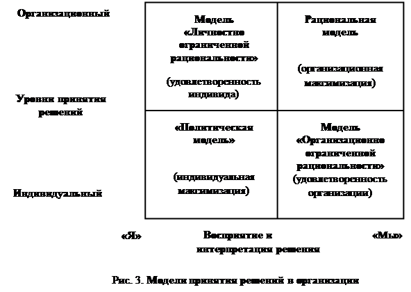 В зависимости от того, как процесс принятия управленческого решения воспринимается и интерпретируется на разных уровнях – индивидуальном или организационном, выделяют четыре модели принятия решений: политическую, личностно ограниченной рациональности, рациональную и организационно ограниченной рациональности (рис. 3). «Политическая модель» отражает желание работников максимально реализовать свои индивидуальные интересы. Принимаемые решения являются функцией распределения власти в организации и демонстрируют эффективность политики, используемой различными участниками процесса. Например, руководство устанавливает себе высокую зарплату, значительно превышающую среднюю по предприятию. В модели «Личностно ограниченной рациональности» при принятии решений преобладают индивидуальные убеждения (предубеждения) менеджера в отношении целей своего подразделения. Оценочные критерии берутся из прошлого опыта и базируются на суждениях. Проблема упрощается, анализ альтернатив тоже. Работники преследуют цели индивидуальной удовлетворенности, а не максимизации общего результата компании. Руководитель единолично решает вопросы использования прибыли компании. Например, если руководителю ближе производственные вопросы, он будет инвестировать в производство, если финансовые – то вкладывать в финансовые спекуляции. Модель «организационно ограниченной рациональности» похожа на предыдущую. Отличие состоит в том, что выбор решений основан на организационных предубеждениях, требующих минимальных усилий от работников. Например, предубеждения связаны с жилищным строительством, организации навязывается строительство жилого дома, и несколько лет все работники будут нести данное бремя, хотя квартиры получат только избранные члены коллектива. Другие варианты лучшего использования средств не обсуждаются. Может быть положительный вариант организационных предубеждений, когда прибыль направляют на развитие компании. Рациональная модель предполагает выбор такого решения, которое принесет максимум выгоды для организации. При поиске решения проблема всесторонне исследуется, идет тщательный поиск альтернатив, отбор данных и их углубленный анализ. Оценочные критерии устанавливаются в начале поиска. Решение принимается беспристрастно, на основе выбора лучшей альтернативы для организации. Эта модель является наиболее предпочтительной для организации. Рассмотренные модели дают представление о том, как принимаются решения в организации: выбор осуществляется не всегда рационально, чаще иррационально. Типичными случаями проявления иррациональности являются стремление достичь индивидуальной и организационной максимизации, удовлетворенности индивида. Знание этого аспекта принятия решений позволяет совершенствовать процедуры обсуждения альтернатив и выбора рационального варианта. Кросс-культурная коррекция зарубежных моделей принятия управленческих решений В России становится все более очевидным, что отсутствие знаний по менеджменту не может заменить даже хорошо развитая интуиция руководителя, особенно тогда, когда компания борется за свое процветание в быстро меняющемся мире, стремится приспособиться к внешним факторам, главным из которых становится потребитель. Но инерция прошлого настолько велика, чт