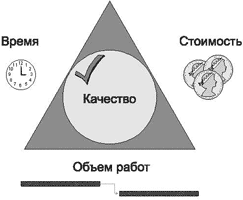 Більшість проектів мають певні дату закінчення, бюджет і обсяг робіт. Це тріо часу, грошей і обсягу робіт часто називають проектним трикутником (рис. 1), тому що при внесенні змін в один з цих елементів змінюються обидва інших. І хоча для проекту в рівній мірі важливі всі три елементи, як правило, тільки один з них залежно від пріоритетів має найбільший вплив на інші.