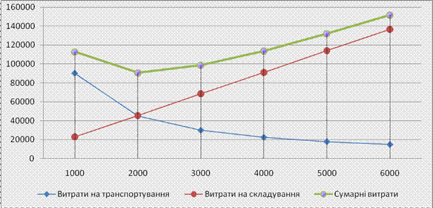 Як видно із графіку (рис.1 витрати F досягають свого мінімального значення у точці на графіку (точка перетину Fр та Fu ), де є однаковими обидві суми витрат та темпи зміни Fр та Fu . Результати вирішення моделі управління запасами графічним методом по рисунку 1: оптимальний розмір партії поставки приблизно 2000 тонн, мінімальні сумарні витрати на поставку та зберігання – близько 90600 грн. Для підприємства економічно вигідніший розмір партії борошна буде 2000 тони, тому що витрати на 22200 грн. менші чим за партію 1000 тон