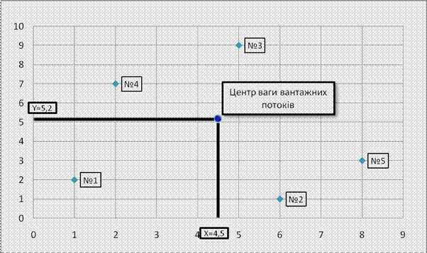 Задача 4. Ми маємо п’ять споживачів однорідної продукції, координати цих споживачів у прямокутній системі координат, вантажообіг кожного споживача. Необхідно знайти координати точки (Xсклад ; Yсклад ) для розміщення розподільчого складу, що обслуговує цих п'ятьох споживачів у прямокутній системі координат, і вказати цю точку на кресленні. Таблиця 14.