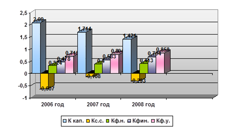 Динамика показателей финансовой устойчивости (Рисунок 4) свидетельствует о том, что за весь анализируемый период организация показала себя весьма независимой от заёмных источников финансирования и её положение можно назвать устойчивым. Данные, коэффициента капитализации (Ккап. ) в 2008 году свидетельствуют о достаточной финансовой устойчивости организации. Его значение снизилось на 29,3%. В целом же за период с 2006 по 2008 год значение коэффициента снизилось на 66,9%.Это положительная динамика для предприятия. Однако коэффициент соотношения собственных и заёмных средств даёт лишь общую оценку финансовой устойчивости. Этот показатель необходимо рассматривать в увязке с коэффициентом обеспеченности собственными средствами (Кс.с. ). На рассматриваемом предприятии собственными оборотными средствами за анализируемый период вообще не покрывались оборотные активы. Значение коэффициента отрицательно и не соответствует нормативу, с течением времени улучшений не наблюдается. Значение коэффициента финансовой независимости (Кф.н. ) находится в пределах границ нормального ограничения, что свидетельствует о благоприятной финансовой ситуации, наблюдается небольшое увеличение значения за три года (+8,9%). Собственникам на конец 2008г. принадлежат 41,3% в стоимости имущества. Этот вывод подтверждает и значение коэффициента финансирования (Кфин. ), показывающий, что на конец 2008г. 70,4% деятельности организации финансировалось за счёт собственных средств. Рост значения коэффициента за весь период составил 22,6%. Коэффициент финансовой устойчивости (Кф.у. ) также находится выше ограничения и показывает, что в конце анализируемого периода 85,8% активов финансировалась за счёт устойчивых источников. Динамика коэффициента положительна (+14,3 %).