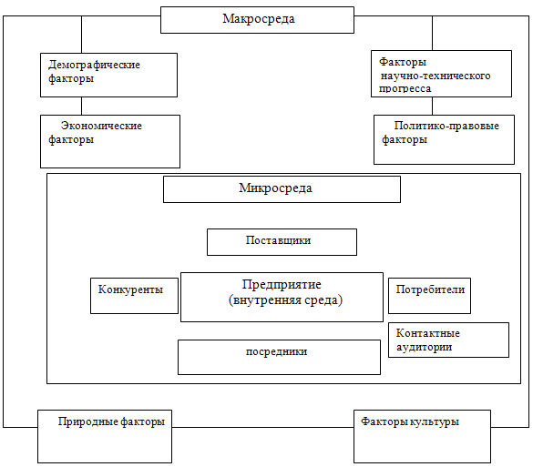 Рисунок 1.2 – Маркетинговая среда 1.2 Анализ микросреды Микросреда-само предприятие и субъекты рынка, которые имеют непосредственное отношение к предприятию. К ним относятся: сама компания, посредники, поставщики, конкуренты, клиенты и контактные аудитории. Все подразделения компании образуют внутреннюю среду компании. Все эти взаимосвязанные группы участвуют в разработке планов и деятельности службы маркетинга. Поставщики – это компании или частные лица, обеспечивающие компанию и ее конкурентов материальными ресурсами, необходимыми для производства товаров и услуг. Посредники – это компании, которые помогают, продвигать, продавать и распространять товары среди конечных потребителей. Контактная аудитория-всякая группа, имеющая действительный или потенциальный интерес к работе компании. Анализ внутренней среды предприятия Особое значение в маркетинговой деятельности играет оценка внутренней среды предприятия. Анализу подлежат: 1) персонал; 2) организация управления; 3) финансовая деятельность; 4) производство (оказание услуг); 5) маркетинг. Были опрошены 10 человек (устный опрос), которым предложили выявить несколько важных для них характеристик предприятия. Оценку внутренней среды компании ООО "Парикмахерская "Молодость" представим в виде таблицы, в которой представлены характеристики, по которым проводится оценка каждого показателя в баллах. Причем каждый показатель может оцениваться от высшего +2 до низшего -2. Причем: 2 – наиболее сильные стороны предприятия; 1 – незначительные сильные стороны предприятия; 0 – нейтральный фактор; -1 – незначительные слабые стороны предприятия; -2 – значительные слабые стороны предприятия. Таблица 1.2.1 – Оценка внутренней среды предприятия ООО "Парикмахерская "Молодость"