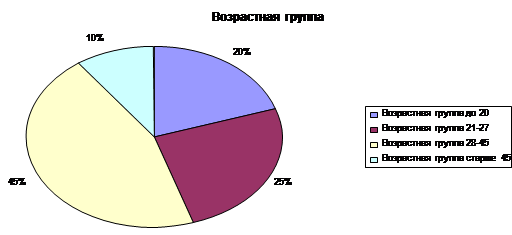 Рисунок 2.1.2- Диаграмма возрастной группы клиентов салона "Молодость" Диаграмма показывает, что парикмахерскую "Молодость" в большинстве своем посещают женщины среднего возраста (от 28 лет до 45 лет). Их устраивает и цена на предлагаемые услуги, и качество обслуживания, и вид услуг. Но, чтобы привлечь новых клиентов разных возрастных групп салону "Молодость" надо создать новые услуги или преобразовать старые. Например, для людей в возрасте до 20 лет предложить молодежные стрижки, прически. Также открыть солярий и наращивание ногтей. Для пенсионеров сделать льготы и приемлемые цены.
