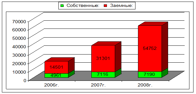 Из расчетов видно, что основным источником финансовых ресурсов ООО «Курганстальмост Лес» являются заемные источники в 2006г.-74,5%, из них все краткосрочные; в 2007г.-81,5%, 2008г.-88,4% основную часть занимают долгосрочные 72%, 44,7% соответственно. В 2008г. предприятие использует лизинг 10,3% заемных средств. Удельный вес собственные средств уменьшился в 2006г.-25,5%, в 2008г.-11,6%, а в денежном выражении они увеличились на 2229тыс. руб. с 2006г. по 2008г. за счет увеличения нераспределенной прибыли. Привлеченные средства у организации отсутствуют. Увеличение заемных средств, связано с нехваткой собственных средств организации для расширения производства. В целом все источники финансовых ресурсов увеличились на 42480 тыс. руб. Рассмотрим динамику структуры источников формирования финансовых ресурсов на рисунке 1.