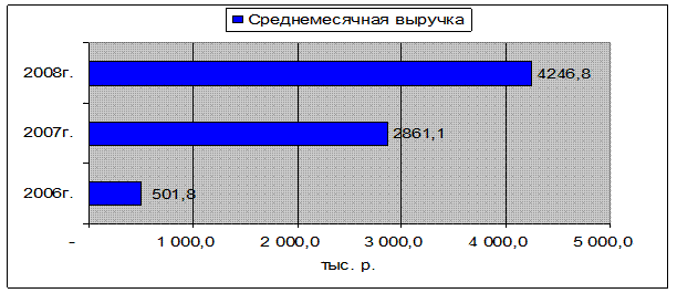 С 2006г. по 2008г. среднемесячная выручка увеличилась на 3745 тыс. р. это положительный момент, так как у предприятия появляется больше средств для осуществления своей деятельности, в том числе для исполнения обязательств перед фискальной системой государства, другими организациями, своими работниками. Доля денежных средств уменьшилась, это говорит о том, что снизилась возможность своевременного исполнения организацией своих обязательств, в том числе исполнение обязательных платежей в бюджеты и внебюджетные фонды. Среднесписочная численность работников увеличилась на 73 чел. В связи с расширением производства. Динамика среднемесячной выручки показана на рисунке 2