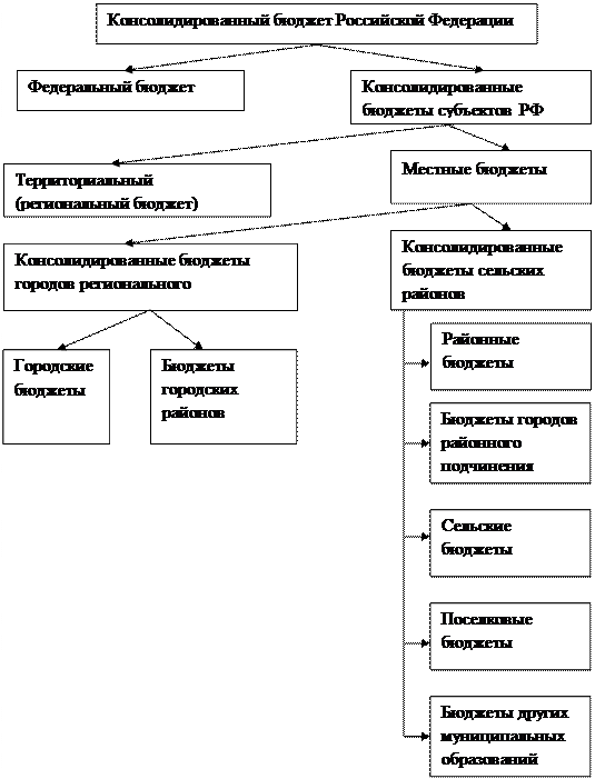 1.2 Структура государственного бюджета Российской Федерации. Структура госбюджета. Бюджетная система зависит от формы государственного и административного устройства страны. В унитарных государствах бюджетная система состоит из двух основных звеньев – государственного и местных бюджетов, в федеративных – из трех – федерального бюджета, бюджетов субъектов (частей) федерации и местных бюджетов. Иногда местные бюджеты в свою очередь подразделяются на отдельные уровни. Такое деление существует, например, в США. В соответствии со статьей 10 Бюджетного кодекса РФ бюджетная система современной России состоит из бюджетов трех уровней: Федеральный бюджет и бюджеты государственных внебюджетных фондов; Местные бюджеты. Внебюджетный фонд – это фонд денежных средств, образуемый вне федерального бюджета и бюджетов субъектов федерации и предназначенный для реализации прав граждан на пенсионное обеспечение, социальное страхование, социальное обеспечение в случае безработицы, охрану здоровья и медицинскую помощь. Совокупность бюджета субъекта Российской Федерации и бюджетов входящих в него муниципальных образований называется консолидированным бюджетом субъекта Российской Федерации. В бюджетную систему РФ как самостоятельные части входят: федеральный бюджет, республиканские бюджеты республик в составе РФ, краевые, областные бюджеты краев и областей, городские бюджеты городов Москвы и Санкт-Петербурга, областной бюджет автономной области, окружные бюджеты автономных округов, районные бюджеты сельских районов, городские бюджеты городов, районные бюджеты районов в городах, бюджеты поселков и сельских населенных пунктов. Свод бюджетов всех уровней бюджетной системы РФ на соответствующий год представляет собой консолидированный бюджет РФ (рис. 1.)