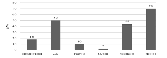 Рис. 2.1. Учреждения культуры, посещаемые населением Обратим внимание на возраст посетителей учреждений культуры. На рисунке 2.2 графически показано соотношение посетителей по возрастным группам. Мы видим, что молодое поколение в возрасте 18 – 25 лет преобладает среди посетителей библиотек, зоопарка и парков, в меньшей степени эти учреждения посещают граждане старше 50 лет. Отметим, что люди этой возрастной категории (старше 50 лет) отдают предпочтение мероприятиям, проводимыми городскими ДК, а также театральным постановкам.