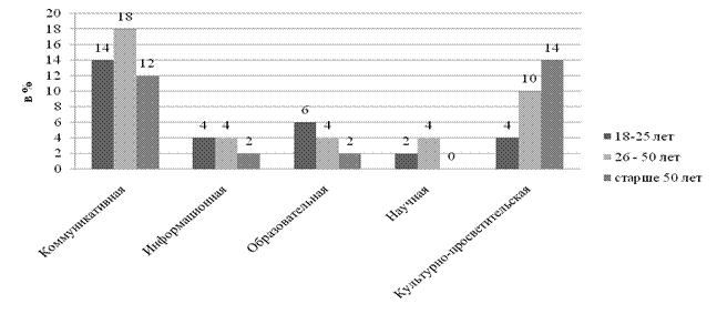 Рис. 2.4. Цели посещения учреждений культуры Рассмотрим как соотносятся цели посещения учреждений культуры с возрастом респондентов (см. рисунок 2.5). Коммуникативная цель в большей степени характерна для граждан в возрасте от 26 до 50 лет. Информационную цель в большей степени преследуют посетители в возрасте от 18 до 50 лет. С образовательной целью учреждения культуры в большинстве посещает молодое поколение 18 – 25 лет. Научную цель преследуют в основном респонденты от 26 до 50 лет. А культурно–просветительскую цель ставят для себя в большей степени граждане старше 50 лет, а также респонденты 26 – 50 лет.