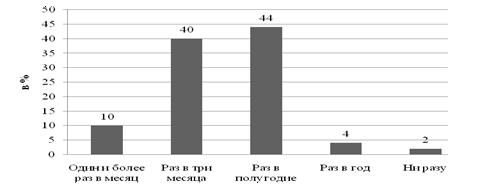 Рис. 2.7. Достижение целей посещения учреждений культуры Почти половина опрошенных посещает учреждения культуры один раз в полугодие, чуть меньше респондентов – раз в три месяца. Сравнительно небольшой процент опрошенных посещает учреждения культуры один и более раз в месяц. Также среди опрошенных есть те, которые за прошедший год ни разу не посетил ни одного учреждений культуры. Графически это изображено на рисунке 2.8. Также необходимо отметить, что такое соотношение характерно в зависимости от возраста и уровня образования.