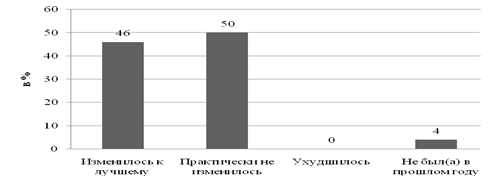 Рис. 2.8. Частота посещений учреждений культуры Мнение опрошенных на вопрос о том, изменилось ли качество услуг,оказываемых учреждениями культуры разделилось на 2 большие группы, графически это изображено на рисунке 2.9. Половина опрошенных считает, что качество услуг осталось на прежнем уровне, чуть меньше респондентов считают, что качество услуг улучшилось. Следует отметить и то, что никто из респондентов не считает, что качество оказываемых услуг ухудшилось. Также необходимо отметить, что такое соотношение характерно в зависимости от возраста и уровня образования.