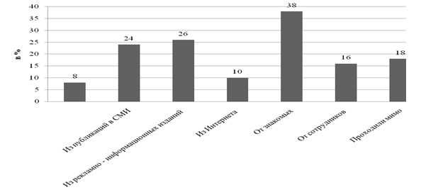 Рис. 2.10. Причины, затрудняющие более частое посещение учреждений культуры В рамках данного исследования были определены основные источники получения населением информации об услугах учреждений культуры (см. рисунок 2.11.). Мы видим, что большая часть населения получает информацию об учреждениям культуры и проводимых ими мероприятиях от своих знакомых, друзей, коллег, родственников. Чуть меньшее количество опрошенных получает информацию из рекламно–информационных изданий и публикаций в СМИ. Часть опрошенных получает информацию из личных наблюдений или от сотрудников учреждений культуры (по справочному телефону). Совсем небольшой процент опрошенных узнает о проводимых мероприятиях через интернет и из информации, представленной в помещениях учреждений культуры. Также необходимо отметить, что такое соотношение характерно в зависимости от возраста и уровня образования.