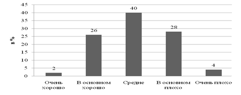 Рис. 2.11. Источники получения информации о деятельности учреждений культуры Теперь следует обратить внимание на мнение опрошенных о степени информированности населения об услугах учреждений культуры (см. рисунок 2.12.). Мы видим, что около половины респондентов оценивают уровень информированности как средний. Четверть опрошенных оценивает степень информированности населения в основном хорошо, а другая четверть – в основном плохо. Также необходимо отметить, что такое соотношение характерно в зависимости от возраста и уровня образования.