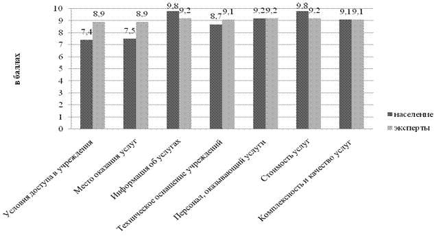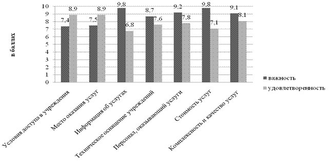 Рис. 2.13. Сравнение важности и удовлетворенности факторов, влияющих на качество и доступность деятельности учреждений культуры (мнение населения) Сопоставляя оценки населения и экспертов о важности факторов, влияющих на удовлетворенность населения качеством и доступностью деятельности учреждений культуры, мы получили следующие результаты. Равный уровень значимости у населения и экспертов на следующие факторы: персонал, оказывающий услуги и комплексность и качество оказываемых услуг. Важность таких факторов, как условия доступа в учреждения, место оказания услуг, техническое оснащение учреждений культуры по мнению населения ниже,чем по оценкам экспертов. А таким факторам, как информация об оказываемых услугах и стоимость этих услуг эксперты присвоили более низкие баллы, чем население. Графически это представлено на рисунке 2.14.