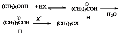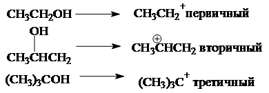 В зависимости от строения спирта образуются первичные, вторичные и третичные карбкатионы: