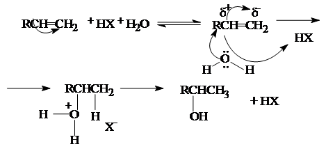 Реакция отщепления воды от спиртов протекает через стадию образования карбкатиона: