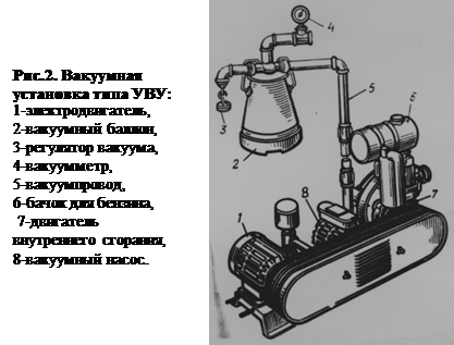 Состоит из вакуум–насоса, электродвигателя, резервного двигателя внутреннего сгорания, общей рамы, вакуумного баллона, глушителя и пускового щита. Ротационный вакуумный насос типа УВУ – состоит из ребристого чугунного корпуса с реувитой поверхностью теплоотдачи. В средней части корпуса находится всасывающий канал, а два выхлопных канала размещены в правой и левой крышках корпуса. Ротор имеет четыре паза, в которых перемещаются текстолитовые термостойкие пластины, образующие при вращении в корпусе камеры переменного объема. Вал ротора вращается в шарикоподшипниках, уплотненных металлическими шайбами и резиновыми манжетами герметизации. Крышки фиксируются установочными штифтами и крепятся болтами к корпусу после установки требуемого зазора (0,04…0,08) между ротором и корпусом. Проверяют зазор плоским щупом, разница зазора должна быть не более 0,02 мм. Собранный насос устанавливают на раму. В средней части имеются выхлопные окна, которые соединяются с выхлопной трубой рамы. На конец выхлопной трубы насаживают глушитель, корпус которого заполнен стекловатой для задержания отработавшей смазки. Смазка насоса самотечная, фитильная. Масленки (по одной на каждую опору крышки), имеют метки, показывающие максимальный и минимальный уровень смазки. Масло засасывается фитилями и через отверстия в корпусе проходит к подшипникам и канала в крышках, откуда поступает в пазы ротора, смазывая его торцы и поверхность лопаток. Расход масла регулируют изменением числа лопаток в фитиле. Используется летнее дизельное масло Дп – 8 или Дп – 11 и зимнее индустриальное масло 12 и 20. Насосы типа УВУ разбираются только в случаях их выхода из строя или для замены лопаток. Таблица 1. Техническая характеристика вакуумных насосов для доильных установок
