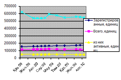 Из числа зарегистрированных юридических лиц наибольшее количество отмечается в г. Алматы – 60879 (35 %), г. Астана – 17047 (10 %), в Южно-Казахстанской области – 15068 (9 %), Восточно-Казахстанской области – 10668 (6 %). Наибольшая численность занятых в сфере малого бизнеса отмечается в Южно-Казахстанской области – 237083 человек или 15 % от общей численности занятых в малом бизнесе, г. Алматы – 216303 человек (13 %), Алматинской области – 178874 человек (10 %). Наименьшая численность в Кызылординской области – 40785 человек (3 %). На торговлю, ремонт автомобилей, бытовых изделий и предметов личного пользования приходится 30% от общей численности занятых в малом бизнесе, на сельское хозяйство, охоту и лесное хозяйство - 30,2%, на строительство – 17,7%, на промышленность – 14,7%. К числу факторов, повлиявших на увеличение числа занятых в малом бизнесе, следует отнести проводимую правительством последовательную политику поддержки малого бизнеса, в том числе через формирование соответствующего законодательства. Для того, чтобы наглядно рассмотреть динамику развития малого бизнеса в Республике Казахстан за последнее время, проанализируем статистические данные о развитии малого бизнеса, отображенные на таблице 3. Используя данные таблицы 3 была построена диаграмма приведённая на рисунке 2. Рисунок 2 - Анализ показателей развития малого бизнеса в Республике Казахстан Из таблицы 3 и рисунка 2 видно, что количество предприятий малого бизнеса растёт из месяца в месяц, причём рост поступательный, не имеющий каких либо скачков и спадов, это обстоятельство характеризует предпринимательство в стране как стабильно развивающееся. Кроме того, из графика на рисунке 3 видно, что количество активных единиц в среднем составляет треть от количества зарегистрированных. Необходимо также отметить, что количество «ложных» (неработающих) предприятий малого бизнеса превышает количество активных. Данный факт свидетельствует о проблемах, в связи с которыми данные предприятия не работают. Проведенный анализ сектора малого бизнеса показывает, что слабые стороны практически не изменились с 1997 года, к ним можно отнести следующее. - Отсутствие четко выраженных практических мер по проведению политики поддержки малого бизнеса и подготовки кадров. - Противоречивость законодательных и нормативных актов. - Проблемы доступа к финансовым источникам (отсутствие стартового капитала, эффективного залогового и страхового механизма). - Отсутствие эффективного механизма кооперации с крупными предприятиями, условий для развития франчайзинга. - Отсутствие у начинающих предпринимателей знаний и навыков работы в рыночных условиях, их правовая неосведомленность. - Бюрократизм, коррупция, вымогательство. - Слабость и фрагментарность инфраструктуры поддержки малого предпринимательства. - Жесткая налоговая и таможенная политика, особенно в вопросах администрирования. - Повышенная чувствительность малого предпринимательства к экономическим изменениям. - Низкий уровень специализации малого предпринимательства, недостаточный уровень необходимого информационного обеспечения. Если рассматривать отраслевую структуру малого предпринимательства, то с начала 90-х годов она практически не менялась. Основная часть предпринимателей занимается торгово-посредническими услугами, промышленные предприятия зани