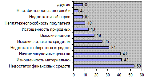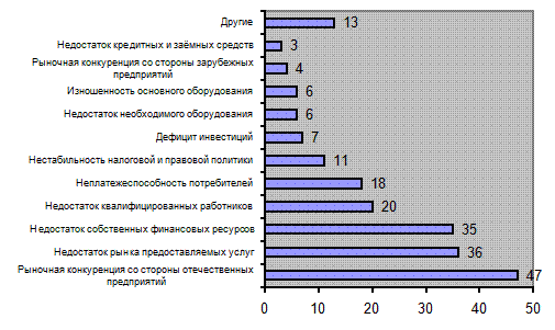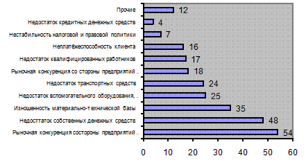 Рисунок 5 - Факторы, ограничивающие рост объёмов транспортных услуг в 2009 г. В частности, в I квартале 2009г. по сравнению со IV кварталом 2008г. о неизменности деловой активности на своих предприятиях сообщили 71% руководителей, о росте - 12% и о спаде - 16% (в IV квартале 2005г. об этом сообщали соответственно 64%, 18% и 13%). Большинство руководителей предприятий негосударственной формы собственности отметили снижение деловой активности по сравнению с предыдущим кварталом. Так, баланс изменения оценок деловой активности на этих предприятиях снизился с (+5)% до (-4)%. В I квартале 2009г. более 24% руководителей опрошенных транспортных предприятий отметили высокий уровень конкуренции со стороны предприятий данного вида транспорта по сравнению с предыдущим кварталом, 43% - умеренный уровень, 5% - слабый, 6% -отсутствие конкуренции и 1 7% - затруднились оценить (в IV квартале 2008г. об этом сообщали соответственно 25%, 42%, 4%, 6% и 17%). В то же время 10% респондентов оценили уровень конкуренции со стороны предприятий других видов транспорта как "высокий", 20% - как "умеренный", 6% - как "слабый", 12% - как "никакой" и 22% затруднились дать оценку (в IV квартале 2008г. давали оценку уровню конкуренции соответственно 12%, 18%, 5%, 9% и 25% респондентов). Фактор "проникновение на рынки других предприятий" (53% от общего числа ответивших) оставался доминирующим в усилении конкуренции услуг предприятий и в 2009г. Для 15% -"сокращение внутреннего платежеспособного спроса", для 8% - возможность конкурентов свободно рекламировать свои услуги". Среди факторов, ограничивающих деловую активность автотранспортных предприятий, самыми значимыми, по оценкам предпринимателей, в 2009г. оставались "рыночная конкуренция со стороны предприятий данного вида транспорта", "недостаток собственных финансовых средств" и "изношенность материально-технической базы" (рисунок 5).