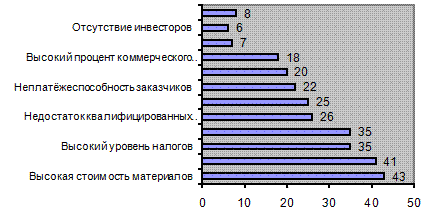 Рисунок 4 - Факторы, ограничивающие строительную деятельность 2009 г. (в % к общему числу ответов) В 2009г., по оценкам большинства респондентов, спрос на услуги строительных организаций снизились доходы и обеспеченность собственными финансовыми ресурсами; снизилась стоимость строительно-монтажных работ. Индекс предпринимательской уверенности, характеризующий деловую активность обследованных строительных организаций, увеличился по сравнению с IV кварталом 2008г. с (-10)% до (+3)%. В структуре выполняемых работ в строительном секторе около 70% от общего числа приходится на организации, осуществляющие преимущественно жилищное строительство. Сокращение портфеля заказов и физического объема работ строительных организаций привели в начале I квартале 2009г. к сокращению численности занятых. В 2009г. баланс изменения оценок численности занятых составил (-12)%, в предыдущем квартале - (-10)%. Среди факторов негативно влияющих на деловую активность строительных организаций, ведущие позиции сохранили в 2009г. "высокая стоимость материалов, конструкций, изделий", "недостаток заказов на работы" и "высокий уровень налогов" (рисунок 3). Результаты обследования свидетельствуют о том, что в I квартале 2009г. отмечалось ухудшение конъюнктуры на транспорте. В частности: - отмечалось уменьшение доли организаций, у которых наблюдалось увеличение спроса и объемов грузооборота и пассажирооборота. - наблюдались снижение оценок численности занятых, обеспеченности собственными финансовыми ресурсами и экономической ситуации. В 2009г. наблюдалось снижение деловой активности опрошенных предприятий транспорта по сравнению с предыдущим кварталом.
