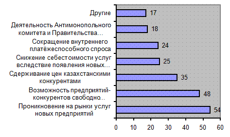 Рисунок 6 - Факторы, усиливающие конкуренцию на рынке услуг в 1 квартале 2009 г. Результаты обследования свидетельствуют о том, что в 2009г. существенных изменений в отношении деловой активности обследованных предприятий связи не произошло. В частности по сравнению с предыдущим кварталом: - спрос на услуги связи и объем реализации услуг существенно не изменились; - отмечалось незначительное сокращение численности занятых; - роста тарифов на оказываемые услуги не наблюдалось; - значительного увеличения как дебиторской задолженности, так и задолженности по обязательствам также не наблюдалось; - собственные финансовые ресурсы остались на уровне предыдущего квартала. В числе факторов, препятствующих конкуренции услуг на рынках сбыта предприятия связи в 2009г., отмечены наличие национального оператора монополиста на рынке (об этом сообщили 47% респондентов), трудности с получением лицензии на отдельные виды деятельности (17%). Неизменность уровня спроса не повлияло на рост объемов реализации услуг. Баланс изменения оценок объема реализации составил в конце I квартала 2009г. (+18)% (в конце IV квартала 2005г. -(+23)%). На предприятиях национальной почты, курьерской деятельности и электросвязи также отмечено снижение баланса изменения оценок объема реализации. Более трети руководителей опрошенных предприятий (34%) отметили в I квартале 2009г. высокий уровень конкуренции со стороны казахстанских предприятий, 42% - умеренный уровень, 5% - слабый уровень, 3% - никакой уровень и 10% - затруднились оценить. В то же время 7% и 8% респондентов сообщили о высоком уровне конкуренции соответственно со стороны предприятий ближнего и дальнего зарубежья, 13% и 8% - умеренном уровне, 6% и 3% -слабом, 18% и 21% - никаком, 25% и 27% соответственно затруднились оценить уровень конкуренции. Доминирующим фактором, который оказывал влияние на усиление конкуренции услуг на рынке сбыта в I квартале 2009г. как и в предыдущем квартале, по оценке руководителей, оставалось "проникновение на рынки сбыта новых предприятий" (рисунок 5). Большинство руководителей опрошенных предприятий в целом по связи (61%) оценили экономическую ситуацию своего предприятия на момент обследования как «удовлетворительную», 26% - как «хорошую» и 7% - как «плохую». При этом 32% руководителей отметили в I квартале 2009г. по сравнению с IV кварталом 2008г. улучшение экономической ситуации на своих предприятиях, 59% сообщили о неизменности и 5% - об её ухудшении (в IV квартале 2008г. об этом сообщали соответственно 31%, 63% и 4%). В 2009г. доминирующее положение среди факторов, ограничивающих деятельность опрошенных предприятий связи, продолжает занимать фактор "рыночная конкуренция со стороны отечественных предприятий" (54% от общего числа ответивших). Деятельность 38% предприятий ограничивал "недостаток собственных финансовых средств", а 21% - "недостаток рынка предоставляемых услуг", 22% - "недостаток необходимого оборудования", 16% - "неплатежеспособность потребителей", 12% - "изношенность основного оборудования". На деятельность 19% предприятий, по оценкам их руководителей, не оказывают воздействия никакие ограничивающие факторы. Результаты обследования свидетельствуют о том, что в 2009г. существенных изменений основных показателей финансово-хозяйственной деятельности опрошенных торговых предприятий торговли не произошло. В частности отмечалось незнач