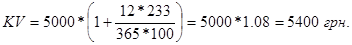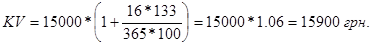 Аналогічно розраховуємо суму боргу на 1 вересня за кредитом під 16% річних: Знаходимо всю суму боргу: 5400 + 15900 = 21300 грн. Задача 4. Автомобіль вартістю 12 тис. USD купується в розстрочку із початковим внеском 3 тис. USD і наступними щомісячними виплатами по 200 USD при ставці 18%. Визначити термін розстрочки і нарощену вартість автомобіля. Рішення 1) Визначаємо термін розстрочки. 12 000 – 3 000 = 9 000 USD 9 000 : 200 = 45 місяців 2) Визначаємо нарощену вартість автомобіля за формулою В = СК*ВС*ДН / 365, де СК – сума кредиту, ВС – відсоткова ставка, ДН – кількість днів в місяці: