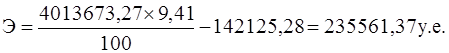 де Тд – додатковий товарообіг викликаний реалізацією плану маркетингу (у.о.); Нт – торгова надбавка на товар в % до ціни реалізації продукції; Ід – додаткові витрати на приріст товарообігу (у.о.); Ір - витрати на рекламу (у.о.). Можливі три результати реалізації рекламної програми: - ефективність реклами = витрати на рекламу; - ефективність реклами < витрати на рекламу; - ефективність реклами > витрати на рекламу. Використовуючи дані маркетингової служби ДП завод «Електроважмаш» і формулу (3.1), визначимо ефективність запропонованого плану маркетингу. При реалістичному прогнозі, на думку керівництва ДП завод «Електроважмаш», при реалізації запропонованих плані маркетингу рекомендацій в 2008 році відбудеться зростання прибутку на 10%, що складе 6198,3 тис. грн. (1227386,14 у.о.). Приймаючи додатковий товарообіг викликаний реалізацією плану маркетингу (дивися п. 2.2.) Тд=20269,05 тис. грн. (4013673,27 у.о.), торгову надбавку на товар в % до ціни реалізації продукції Нт=9,41% і додаткові витрати на приріст товарообігу Ид=0, одержимо: