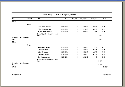 Відомість „Звіт відсотків за кредитом” зображено на рис.5.5. Для отримання відомості треба ввести відсоток, наприклад 25, його код, наприклад, 1 і суму кредиту вище за яку треба вивести розрахунки відсотків, наприклад 1000.