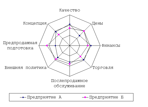 Рис. 1. "Многоугольник конкурентоспособности" Если подойти одинаково к оценке конкурентных возможностей ряда фирм, накладывая схемы друг на друга, то, по мнению авторов, можно увидеть слабые и сильные стороны одного предприятия по отношению к другому (на рис. 1 - предприятия А и Б). Весьма схожую точку зрения высказывают и отечественные экономисты. В частности, к «ключевым факторам рыночного успеха» относят: «финансовое положение предприятия, развитость базы для собственных НИОКР и уровень расходов на них, наличие передовой технологии, обеспеченность высококвалифицированными кадрами, способность к продуктовому (и ценовому) маневрированию, наличие сбытовой сети и опытных кадров сбытовиков, состояние технического обслуживания, возможности по кредитованию своего экспорта (в том числе, с помощью государственных организаций), действенность рекламы и системы связей с общественностью, обеспеченность информацией, кредитоспособность основных покупателей». Анализ же отобранных факторов, по мнению авторов, заключается в выявлении сильных и слабых сторон как в своей деятельности, так и в работе конкурентов, что может позволить, с одной стороны, избежать наиболее острых форм конкуренции, а с другой - использовать свои преимущества и слабости конкурента. Ряд других авторов, анализируя факторы конкурентоспособности предприятия, предлагают иные принципы систематизации. В частности, предлагается их классифицировать в зависимости от целевого назначения создаваемого продукта труда. Для предприятий, создающих товары потребительского назначения, выделяют: а: коммерческие условия - возможности фирмы предоставлять покупателям потребительский или коммерческий кредиты, скидки с прейскурантной цены, скидки при возврате ранее приобретенного у фирмы товара, использовавшего свой экономический ресурс, возможности заключения товарообменных (бартерных) сделок; б: организация сбытовой сети - расположение сети магазинов, супермаркетов, доступность их широкому кругу покупателей, проведение демонстрации изделий в действии в салонах и демонстрационных залах фирмы или у ее торговых посредников, на выставках и ярмарках, эффективность проводимых рекламных кампаний, воздействие средствами «паблик релейшенз»; в: организация технического обслуживания продукции - объем предоставляемых услуг, сроки гарантийного ремонта, стоимость послегарантийного обслуживания и т.д.; г: представление потребителей о фирме, ее авторитете и репутации, ассортименте ее продукции, сервисе, воздействие товарного знака фирмы на привлечение внимания покупателей к ее продукции; д: воздействие тенденций развития конъюнктуры на положение фирмы на рынке. На конкурентоспособность предприятий, перерабатывающих сырье, оказывают влияние, прежде всего, такие факторы, как величина прибыли, получаемой от переработки сырья, которая зависит от качественных и стоимостных характеристик сырья, а также стоимости других производственных ресурсов - рабочей силы, основного капитала, потребляемых топлива и энергии; состояния конъюнктуры рынка конечного продукта переработки сырья, динамики цен в результате колебаний спроса и предложения, расходов на транспортировку сырья к месту переработки или потребления; формы коммерческих и других связей между производителями и потребителя