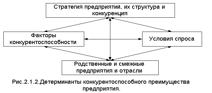 Чтобы получить и удержать преимущества в наукоемких отраслях, составляющих основу любой развитой экономики, необходимо обладать преимуществами во всех составляющих системы. Конкурентное преимущество, основанное на какой-то одной либо двух детерминантах, также возможно. Но только в отраслях с сильной зависимостью от природных ресурсов или отраслях, не использующих смежных технологий и высококвалифицированной труд. Однако такое преимущество обычно кратковременно и теряется со вступлением на данный рынок крупных компаний и фирм. Поэтому преимущества по каждому в отдельности из компонентов системы не является предпосылкой для конкурентного преимущества в отрасли. Лишь взаимодействие преимуществ по всем детерминантам обеспечивает синергетический (самоусиливающийся) эффект системы. Из изложенного выше подхода ясно видно, на сколько велика роль правильного выявления и использования факторов конкурентоспособности. Факторы конкурентоспособности М.Портер напрямую связывает с факторами производства. Все факторы, определяющие конкурентные преимущества предприятия и фирмы отрасли, он представляет в виде нескольких больших групп: 1. Людские ресурсы - количество, квалификация и стоимость рабочей силы. 2. Физические ресурсы - количество, качество, доступность и стоимость участков, воды, полезных ископаемых, лесных ресурсов, источников гидроэлектроэнергии, рыболовных угодий; климатические условия и географическое положение страны базирования предприятия. 3. Ресурс знаний - сумма научной, технической и рыночной информации, влияющей на конкурентоспособность товаров и услуг и сосредоточенной в академических университетах, государственных отраслевых НИИ, частных исследовательских лабораториях, банках данных об исследованиях рынка и других источниках. 4. Денежные ресурсы - количество и стоимость капитала, который может быть использован на финансирование промышленности и отдельного предприятия. Естественно, капитал неоднороден. Он имеет такие формы, как необеспеченная задолженность, обеспеченный долг, акции, венчурный капитал, спекулятивные ценные бумаги и т.д. У каждой из этих форм свои условия функционирования. А с учетом различных условий их движения в разных странах, они будут в значительной степени определять специфику экономической деятельности субъектов в разных странах. 5. Инфраструктура - тип, качество имеющейся инфраструктуры и плата за пользование ею, влияющие на характер конкуренции. Сюда относятся транспортная система страны, система связи, почтовые услуги, перевод платежей и средств из банка в банк внутри и за пределы страны, система здравоохранения и культуры, жилой фонд и его привлекательность с точки зрения проживания и работы. Отраслевые особенности, безусловно, накладывают свои существенные различия на состав и содержание применяемых факторов. Все факторы, влияющие на конкурентоспособность предприятия, М.Портер предлагает делить на несколько типов. Во-первых, на основные и развитые. Основные факторы - это природные ресурсы, климатические условия, географическое положение страны, неквалифицированная и полуквалифицированная рабочая сила, дебетный капитал. Развитые факторы - современная инфраструктура обмена информацией, высококвалифицированные кадры (специалисты с высшим образованием, спец