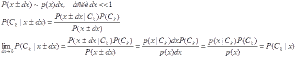 P (a ,b ) – вероятность того, что события а и b наступают одновременно. Если а и b – статистически независимые переменные, то P(a,b) = P(a)P(b) если события зависимые, то P(a,b) = P(b,a) = P(a)*P(b|a) = P(b)*P(a|b) отметим, что из этого равенства следует формула Баеса: P(a|b) = P(b|a)*P(a)/P(b) то есть это можно считать выводом формулы Баеса для распознавания образов, если вместо a и b подставить соответствующие события, описанные ниже. P (a |b ) – условная вероятность . Вероятность наступления события a, при условии что событие b наступило P(Ck,x) = P(x, Ck). Вероятность того что объект имеет признаки, заданные вектором х и при этом принадлежит классу Сk P(Ck|x) - вероятность того, что объект относится к классу Сk, при условии, что его признаки описываются вектором х. Также называется «апостериорная вероятность класса Ck», т.е. иными словами, вероятность после измерения величины х. P(x|Сk) - вероятность того, что объект имеет признаки, описываемые вектором х, при условии что объект относится к классу Ck P(Ck) – вероятность того, что данный объект относится к классу Ck. Также называется «априорная вероятность класса Ck » P(x) – вероятность того, что признаки произвольного объекта из множества объектов задачи распознавания будут иметь вектор признаков х p(x) – функция плотности распределения случайной величины х. формула Баеса для дискретных распределений P(Ck|x) = P(x|Ck)*P(Ck)/P(x) P(C1|x) + P(C2|x) + … P(CM|x) = 1 (где М- число классов в задаче распознавания. Это очевидно, так как объект всегда принадлежит одному из классов в задаче распознавания) Подставляя в эту формулу формулу Баеса получаем: P(x|C1)*P(C1)/P(x) + P(x|C2)*P(C2)/P(x) + … + P(x|CM)*P(CM)/P(x) = 1 домножаем на P(x), эта вероятность очевидно не нулевая получаем P(x|C1)*P(C1) + P(x|C2)*P(C2) + … + P(x|CM)*P(CM) = P(x) поэтому формулу Баеса можно записать и без P(x): P(Ck|x) = P(x|Ck)*P(Ck) / [P(x|C1)*P(C1) + P(x|C2)*P(C2) + … + P(x|CM)*P(CM)] Формула Баеса для непрерывных распределений : P(Ck|x) = p(x|Ck)*P(Ck) / [p(x|C1)*P(C1) + p(x|C2)*P(C2) + … + p(x|CM)*P(CM)] Вывод для одномерного случая:
