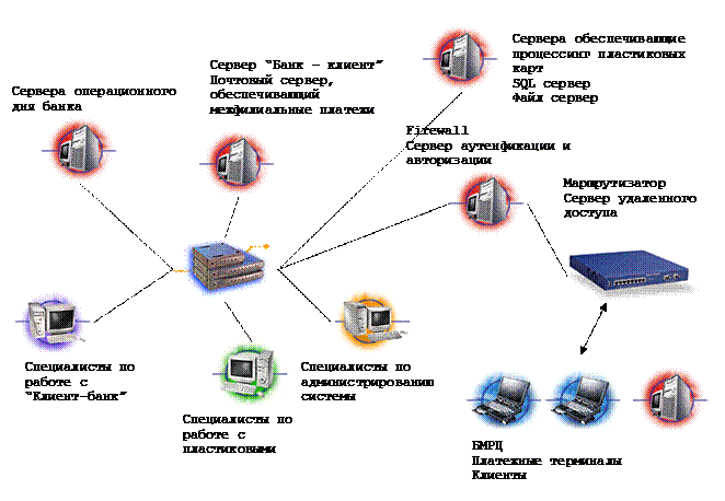 Рис.2 Схема компьютерной сети отдела поддержки электронных платежей В качестве основного транспортного протокола будем использовать TCP IP. Маршрутизатор обеспечивает обмен информацией с другими банками, межбанковским расчетным центром, юридическими и физическими клиентами, процессинговыми центрами, а также обеспечивает подключение к интернет. Для этого будем использовать оборудование “Cisco”, необходимой комплектации. Firewall обеспечивает безопасность сети, ведет протоколы, а также аутенфицирует и авторизирует подключения. В центре сети установлены высокопроизводительные концентраторы. Желательно использовать оборудование “Cisco”, например “Cisco Catalyst”. 4.4. Средства организации баз данных Безусловно необходимо использование технологии клиент-сервер. В качестве SQL сервера возможно применение Oracle SQL или MS SQL. Основное преимущество данных серверов – обслуживание большого количества пользователей. 4.5. Прикладное программное обеспечение Программное обеспечение (software) - это набор команд, управляющих работой компьютера. Без программного обеспечения компьютер не сможет выполнять задачи, которые мы обычно связываем с компьютерами. Функции программного обеспечения следующие: - управлять компьютерными ресурсами организации; - обеспечивать пользователя всеми инструментами, необходимыми для извлечения пользы из этих ресурсов; - выполнять роль посредника между организациями и хранимой информацией. Выбор соответствующего потребностям организации программного обеспечения - одна из ключевых задач управляющего персонала. В качестве прикладных программных продуктов могут быть выбраны как свои разработки, так и продукты сторонних фирм, специализирующихся на написании банковского программного обеспечения. Например “Мебиус”, “Софтклуб”. Например, при работе с пластиковыми карточками будем использовать на сервере систему эмиссии карт разработки компании «TIESTO KONTS Financial Systems» Ltd., а для ведения картсчетов “SC-CARD” от “Софтклуба”. Основные функции данного ПО: - изготовление (эмбосирование, авторизация) пластиковых карт - открытие карт-счетов - сопровождение карт-счетов (проведение расходных транзакций, зачисление на карт-счета, списание по длительным п/п и т.п.) - обеспечение конфиденциальности информации - оперативная обработка исходящий файлов с поступлениями 4.6. Информационное обеспечение Информация, необходимая для работы отдела поступает из следующих источников: - вышестоящие подразделения банка - Redmi-файлы к устанавливаемому ПО - автоматизированная нормативно-информационная система LNAView - нормативно-правовая система «КонсультантПлюс» - другие подразделения банка 5. Технология обработки информации Технология обработки информации отличается в разных подсистемах. Например, в основу подсистемы “межбанковских расчетов” положено осуществление межбанковских расчетов по крупным и срочным платежам на валовой основе в реальном режиме времени (на принципах RTGS). В период зарождения системы электронных платежей банки решили проблему синхронизации путем расчета транзакций через центрального посредника до того, как переводить платежи в банк-получатель. При этом для поддержки распределенной сетевой обработки в электронной среде, необходимо наличие распределенной межбанковской обработки э-платежей. Эту функцию в Беларуси вы
