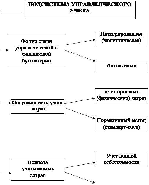 А – производственный учет Б – финансовый учет для внутреннего пользования В – финансовый учет в узком смысле для внешних пользователей Г – налоговые расчеты на базе финансового учета (налоговый учет). Выделяют два подхода к пониманию сущности термина «управленческий учет»: первый связан с management accounting, второй – с европейским «контроллинг» (Германия). В соответствии с первым термином основной задачей любой учетной деятельности является обеспечение управленческого персонала предприятия своевременной и полной информацией для принятия управленческих решений. Это означает, что деятельность по учету неразрывно связана с управлением предприятием в целом и отдельными его частями. Поэтому management accounting может быть переведен как организация учета, исходя из потребностей управления. При таком подходе управленческий учет – не только система сбора и анализа информации об издержках предприятия, но и система бюджетирования, система оценки деятельности подразделений. В целом, это в большей степени управленческие, чем бухгалтерские технологии. В соответствии со вторым понятием управленческий учет рассматривается как система сбора и интерпретации информации о затратах, издержках и себестоимости продукции, т.е. это расширенная система организации учета для целей контроля за деятельностью предприятия. В узком смысле под управленческим учетом можно понимать учет и контроль затрат и доходов, связанных с деятельностью предприятия. В российской практике чаще управленческий учет рассматривается в широком смысле (в соответствии с термином management accounting) как система, которая в рамках одной организации обеспечивает управленческий персонал информацией, используемой для планирования, управления и контроля за деятельностью организации. Предметом управленческого учета является производственная деятельность организации в целом и его отдельных структурных подразделений. Объектами управленческого учета являются издержки предприятия и его отдельных структурных подразделений – центров ответственности; результаты хозяйственной деятельности всего предприятия и центров ответственности; внутреннее ценообразование; бюджетирование и внутренняя отчетность. Различные сочетания экономических, юридических, организационных и технико-технологических факторов определяют разнообразие форм организации управленческого учета .